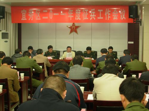 10月28日,宜秀區在區人武部會議室召開2011年征兵工作會議,貫徹落實全市征兵工作會議精神,部署今年全區征兵工作。區委常委、區政府常務副區長、區征兵領導小組副組長程結書出席會議并講話。區委常委、區人武部部長、區征兵領導小組副組長、征兵辦主任徐建軍總結去冬征兵工作,解讀了今冬征兵政策,全面部署今冬征兵任務。區人武部政委、區征兵領導小組副組長李亞波主持會議。區人武部副部長、區征兵領導小組副組長王明理宣讀了區政府、區人武部2011年冬季征兵命令。區公安局局長、區征兵領導小組副組長胡憲明宣讀了表彰2010年度征兵工作先進單位和先進個人的通報。