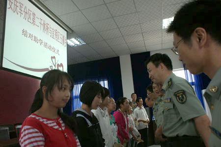 8月24日下午,在市、區婦聯相關負責同志陪同下,安慶市軍分區第二干休所所長吳仕茅、政委徐蔚帶領該所全體官兵與五橫鄉13名貧困生結成愛心幫扶對子,官兵們給每位學子送上助學金1000元。