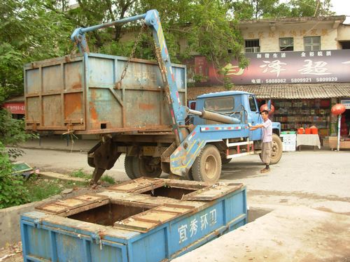 圖為8月11日,環(huán)衛(wèi)工人在白澤社居委路口調(diào)運垃圾轉(zhuǎn)運箱。