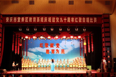 為紀念中國共產黨建黨90周年,弘揚熱愛中國共產黨、堅定不移跟黨走精神,引導全體教職工唱紅歌,更好地踐行科學發展觀,為宜秀教育工作發展營造良好氛圍,6月23日,宜秀區教育系統慶祝建黨90周年紅歌合唱比賽在安慶市人民劇院隆重舉行。區領導李順琪、丁邦華、葉林霞、嚴鋒、程結書、程賢華、高青琳、曹傳文、施勤、戴蓬等饒有興致地觀看了比賽并為獲獎單位頒獎,市教育局領導、區直部分單位、區關工委、各鄉鎮分管同志應邀觀看了比賽。局長黃虛實首先致辭。來自全區教育系統13家單位1200余名師生引吭高歌,抒發了對黨和祖國的火熱情懷,唱出了對美好生活的熱愛。