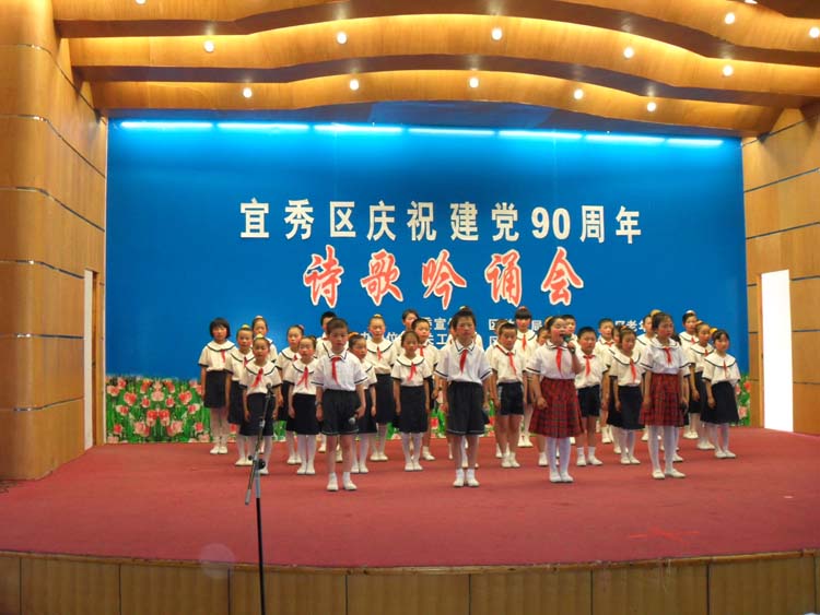 5月30日上午,宜秀區慶祝建黨90周年詩歌吟誦會在安慶市科技館一樓大廳隆重舉行。此次活動是宜秀區宣傳部、教育局、關工委、文明辦、團委主辦,由區老年大學、大龍山詩書畫協會、楊橋初級中學和大龍山中心學校承辦。燈火輝煌的舞臺上,老年大學的學員們為我們表演了舞蹈、獨唱、薩克斯獨奏等節目;楊橋初中的學生為大家獻上中華古典詩詞,形式多樣,有誦讀,有演唱;大龍山中心學校和永林小學的孩子、老師們也帶來了他們對中國共產黨的無比崇敬和熱愛。