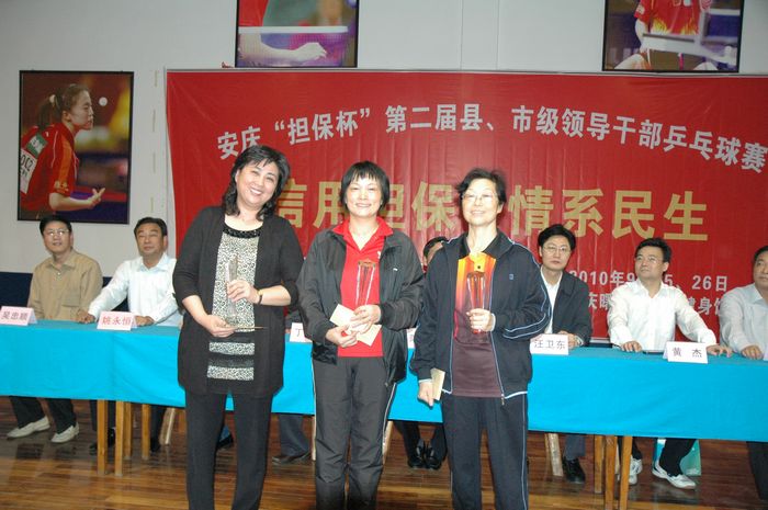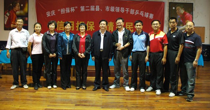 9月26日下午,安慶曙光乒乓球館里一片歡歌笑語,人頭攢動(dòng),掌聲如潮。這里正在舉行安慶“擔(dān)保杯”第二屆縣、市級(jí)領(lǐng)導(dǎo)干部乒乓球賽頒獎(jiǎng)儀式。“團(tuán)體總分第一名,宜秀區(qū)!”“男子團(tuán)體第一名,宜秀區(qū)!”“女子團(tuán)體第一名,宜秀區(qū)!”“女子單打第一名,宜秀區(qū)戴蓬!”一連串的第一,一連串的宜秀區(qū),讓全場歡呼震撼!