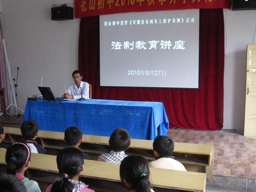 花山初中制作了宣傳橫幅,開辟了專題宣傳欄,重點介紹《安徽省未成年人保護條例》的相關內容,拉開了花山初中《安徽省未成年人保護條例》學習宣傳月活動的序幕;并且校團總支還開展了“法在我心中”的主題班會活動和宣傳《安徽省未成年人保護條例》的黑板報的評比活動以及法制教育講座,就法律所強調的未成年人的一些不良行為進行介紹和分析,幫助學生了解這些不良行為可能導致的后果,并就如何加強防范措施提出建議。