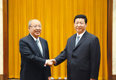 中共中央總書記習近平13日下午在人民大會堂會見了中國國民黨榮譽主席吳伯雄和他率領的中國國民黨訪問團全體成員。