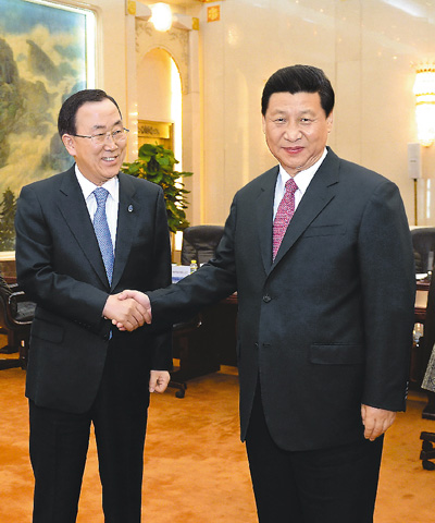 人民網(wǎng)北京6月19日電 (記者吳樂(lè)珺)國(guó)家主席習(xí)近平19日在人民大會(huì)堂會(huì)見(jiàn)聯(lián)合國(guó)秘書(shū)長(zhǎng)潘基文。 習(xí)近平指出,聯(lián)合國(guó)承載著各國(guó)人民的期望,肩負(fù)著諸多重大使命。當(dāng)今世界正在發(fā)生深刻復(fù)雜變化,解決全球性難題和挑戰(zhàn),需要聯(lián)合國(guó)廣大會(huì)員國(guó)攜手努力。聯(lián)合國(guó)要抓住和平與發(fā)展的主題,高舉公平正義的旗幟,講公道話,辦公道事。零和思維已經(jīng)過(guò)時(shí),我們必須走出一條和衷共濟(jì)、合作共贏的新路子。在這方面,聯(lián)合國(guó)應(yīng)該有所作為。 習(xí)近平強(qiáng)調(diào),中國(guó)確立了“兩個(gè)一百年”的奮斗目標(biāo),為未來(lái)國(guó)家發(fā)展繪制了宏偉藍(lán)圖。中國(guó)需要聯(lián)合國(guó),聯(lián)合國(guó)也需要中國(guó)。中國(guó)重視聯(lián)合國(guó),將堅(jiān)定地支持聯(lián)合國(guó)。中國(guó)是聯(lián)合國(guó)安理會(huì)常任理事國(guó),這不僅是權(quán)力,更是一份沉甸甸的責(zé)任。中國(guó)有這個(gè)擔(dān)當(dāng)。中國(guó)將繼續(xù)大力推動(dòng)和平解決國(guó)際爭(zhēng)端,支持聯(lián)合國(guó)推進(jìn)千年發(fā)展目標(biāo),愿同各方一道努力,共同應(yīng)對(duì)氣候變化等問(wèn)題,為世界和平、人類進(jìn)步作出更大貢獻(xiàn)。 潘基文祝賀神舟十號(hào)發(fā)射成功,祝愿中國(guó)人民成功實(shí)現(xiàn)中華民族偉大復(fù)興的中國(guó)夢(mèng),表示中國(guó)夢(mèng)的實(shí)現(xiàn)必將對(duì)聯(lián)合國(guó)及國(guó)際社會(huì)產(chǎn)生深遠(yuǎn)和積極影響。潘基文表示,聯(lián)合國(guó)高度贊賞中國(guó)積極支持和參與聯(lián)合國(guó)維和行動(dòng),推動(dòng)實(shí)現(xiàn)聯(lián)合國(guó)千年發(fā)展目標(biāo),為維護(hù)世界和平、促進(jìn)可持續(xù)發(fā)展作出了重大貢獻(xiàn)。面對(duì)復(fù)雜多變的國(guó)際形勢(shì)以及諸多地區(qū)和全球性問(wèn)題和挑戰(zhàn),聯(lián)合國(guó)需要中國(guó)發(fā)揮更大作用。 雙方還就敘利亞、朝鮮半島局勢(shì)等問(wèn)題交換了意見(jiàn)。習(xí)近平闡述了中方原則立場(chǎng)。 國(guó)務(wù)委員楊潔篪在座。 |