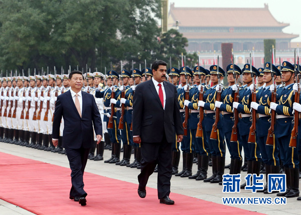 會談前,習近平在人民大會堂東門外廣場為馬杜羅舉行歡迎儀式。習近平主席夫人彭麗媛、全國人大常委會副委員長艾力更·依明巴海、國務委員楊潔篪、全國政協副主席劉曉峰等出席。