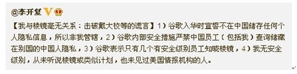 然而斯諾登事件發生后,隨著他不斷將內幕披露出來之后我們駭然發現原來google.cn竟然暗藏棱鏡計劃,監控中國網民的一切信息以及銀行信 用卡信息。然而您卻以自己雖然是google.cn的負責人、責任人以及總裁,但對此并不知情,來推卸責任。那請問是否任何單位,任何企業出事領導人都可 以用“我不知情”來免責?難道您認為田文華是一宗冤案?