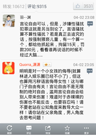 作為一個志愿成為青年導師的人,我想您應該尊重起碼的道德與法治原則,但是很遺憾的是,當一名14歲的中國少女林某在微博上遭遇一群人性騷擾的 時候,您作為一名導師不僅沒有站出來保護她不受性騷擾,卻反而為那些性騷擾者進行辯護稱:“小姑娘,這是人類不可剝奪的言論自由,您長大后會慢慢理解。” 言下之意就是性騷擾是言論自由的一部分,被騷擾人只能選擇接受。