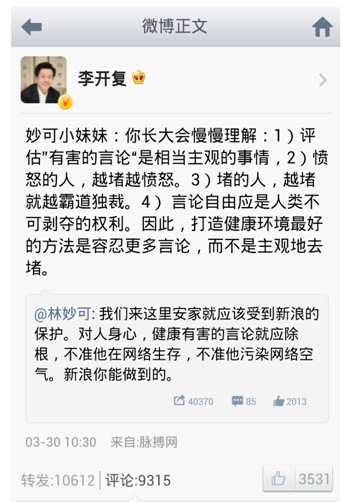 您經常說自己主張言論自由,主張多種觀點并存。但是您卻對一切和您有不同意見的人進行打壓和封殺。每一個愛國人士的微博在新浪都遭遇過封殺和屏蔽。
