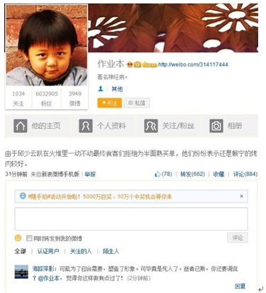 2013年著名微博大謠棍@作業本發布消息稱:“由于邱少云趴在火堆里一動不動最終食客們拒絕為半面熟買單,他們紛紛表示還是賴寧的烤肉較 好。”之后遭萬人痛斥,但您李開復卻表示:“作業本是一個有思想才華,充滿黑色幽默,我行我素的屌絲憤青死胖子。他罵過很多人,也罵過我,但是我還是欣賞 他。我覺得他是一個天生就該寫微博的人,也是一個可以知道分寸的人。”而在2013年開學之際,@作業本更是公然發布長微博宣傳:“不想參加軍訓就假裝暈 倒請病假,至于將來沖鋒前線,留給黨員們好了。記住這個國家和您關系不大,不必為它去奉獻青春或者犧牲生命。”而這篇文章也得到了您的轉發和推廣。