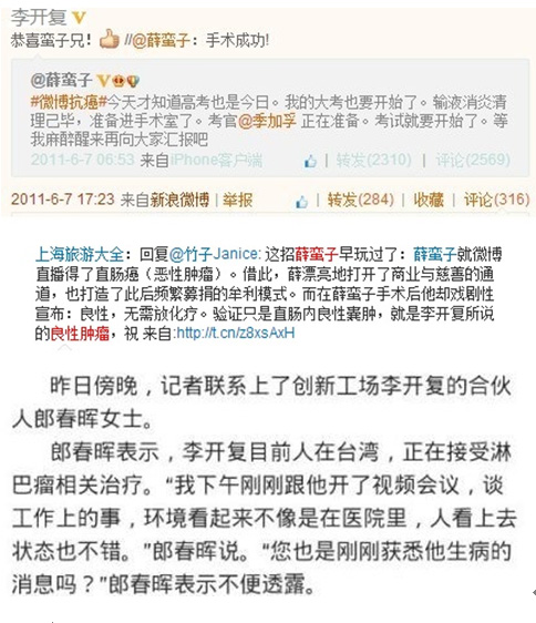 作為一個自稱患癌全身二十多處腫瘤,且正在接受化療的虛弱人士,我想請問您是如何做到繼續狂刷微博的? 此外您選擇到臺灣就醫也是一件很蹊蹺的 事情,由于您長期和臺獨分子來往密切,在中國大陸微博多次替臺獨勢力公開站臺,為謝長廷叫屈,為蔡英文喝彩,鼓吹全盤接受西方憲政,鼓吹放棄中國道路,所 以臺灣民進黨醫院會替您偽造病歷應該不是問題。中國大陸現在有非常先進的檢測儀器,所以如果您若敢于證實自己真的罹患了癌癥,不妨由我們各指定20名網民 陪同您回大陸來選擇最好的醫院進行公開的檢測,自然一清二楚,水落石出。否則很難保證您是不是在接嫖客薛蠻子的班,繼續為強副作用的暴利高價藥劑炒作代 言。