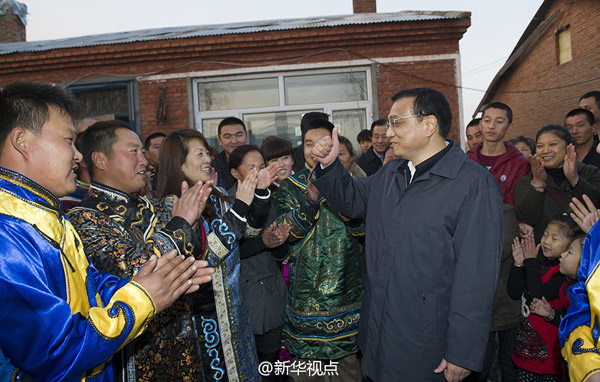 新華網北京11月4日電 據新華社“新華視點”微博報道,今夏,黑龍江撫遠、同江等地遭受特大洪災。臨近寒冬,李克強十分牽掛災區群眾能否溫暖、安全過冬。4日,他來到八岔赫哲族鄉看望受災群眾。在群眾家中,李克強說,政府最惦記你們過冬安全,房屋一定要做到“雙保”,不僅要保暖,安全上更要保險。