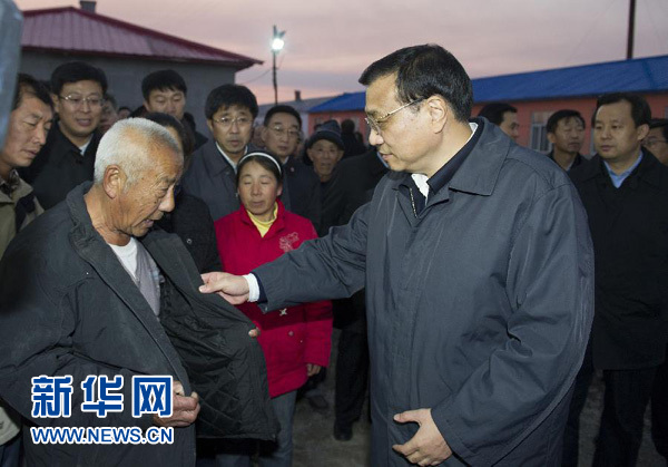 11月4日至6日,中共中央政治局常委、國務院總理李克強在黑龍江同江、撫遠、哈爾濱等地考察。這是4日傍晚,李克強來到同江銀川鄉幸福大院,察看洪災后五保戶和特困戶安置情況。 新華社記者 黃敬文 攝