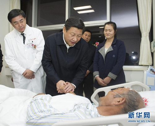 兩天來,習近平一直關(guān)注著事故搶險工作,惦記著在事故中受到損失的群眾。24日下午,習近平一抵達青島,就在山東省委書記姜異康、省長郭樹清陪同下,來到青島大學附屬醫(yī)院黃島分院,看望慰問傷員、醫(yī)護人員和遇難者家屬。他走進病房,先后來到受傷群眾姜瑞芬、薛淑美、徐之泰、孫桂山病床前,同他們親切握手,仔細查看傷情,鼓勵他們配合治療、安心養(yǎng)病。習近平同醫(yī)療專家代表一一握手,肯定他們關(guān)鍵時刻迅速行動、連續(xù)作戰(zhàn)、不怕疲勞的救死扶傷精神,希望他們勞逸結(jié)合、科學調(diào)度、再接再厲,確保每個傷員都得到精心治療。習近平在看望遇難者家屬時,對他們親屬的不幸遇難表示哀悼,希望他們節(jié)哀制痛、樹立生活信心,表示黨和政府一定會盡最大努力安排好大家工作生活。他要求有關(guān)部門要一家一家把善后工作做細做實。