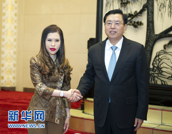 12月10日,全國(guó)人大常委會(huì)委員長(zhǎng)張德江在北京人民大會(huì)堂會(huì)見來(lái)華出席第6屆“中泰一家親”音樂(lè)歌舞晚會(huì)的泰國(guó)朱拉蓬公主。新華社記者謝環(huán)馳攝