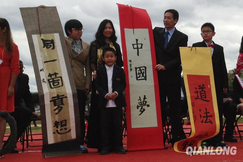 資料圖片:2013年國(guó)慶節(jié),張圣博參加華盛頓第十五屆中國(guó)文化節(jié),展示書寫的“中國(guó)夢(mèng)”作品(千龍網(wǎng)發(fā))。