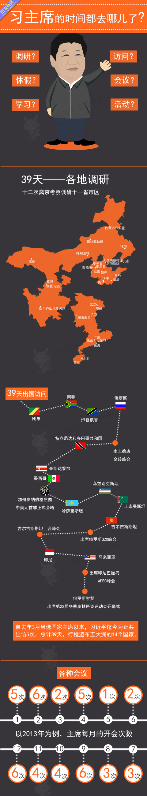 “我個人的時間都去哪兒了?當然是都被工作占去了。”今年2月初,習近平在俄羅斯索契接受俄羅斯媒體專訪時說。根據官方媒體公開報道所不完全統計,自中共十八大至今的近15個月里,習近平國內考察調研、出訪、參加各類會議共80余次,足跡遍及國內三分之一的省份和世界五大洲。