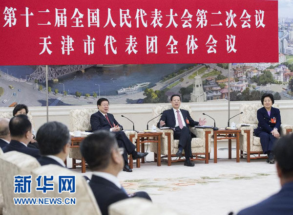 中共中央政治局常委、國務院副總理張高麗6日上午來到他所在的天津代表團,同代表們一起審議政府工作報告。