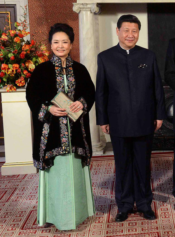 ——在出席威廉-亞歷山大國王舉行的國宴時,習主席與夫人彭麗媛都以中式服裝亮相。習主席穿著的中式服裝色彩飽和,略帶暗光澤,頗具莊嚴感;高密度高支紗的面料讓人感覺嚴謹與厚重;在設(shè)計上,暗門襟的設(shè)計將前胸的紐扣都隱藏起來,沉穩(wěn)大氣,淡去人們對于中山裝的記憶。頗具巧思的是左前胸呼應西裝口袋巾的圖案設(shè)計,體現(xiàn)出對西方禮儀的尊重,也營造出輕松和諧的氛圍。彭麗媛穿著的是牡丹花刺繡的外套,內(nèi)搭粉果綠的長裙,長裙很具有清新感,內(nèi)藏著對綠色環(huán)保的崇尚。中國刺繡素來被西方人所崇尚,牡丹花自古被視為中國的國花,頗具傳統(tǒng)風格的粉果綠色彩,給人以清新感,同時內(nèi)藏對綠色環(huán)保的崇尚。整套服裝具有很鮮明的中國特色,非常符合中國人的審美觀,又符合西方時尚,并且廓形感很強。