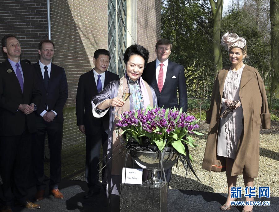 3月23日,中國國家主席習近平和夫人彭麗媛在荷蘭國王威廉-亞歷山大和馬克西瑪王后陪同下參觀中荷農(nóng)業(yè)合作和荷蘭郁金香花展。彭麗媛應邀將新培育的郁金香命名為“國泰”,并按當?shù)貍鹘y(tǒng)澆上香檳。資料圖