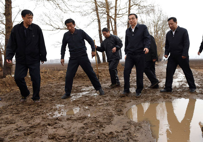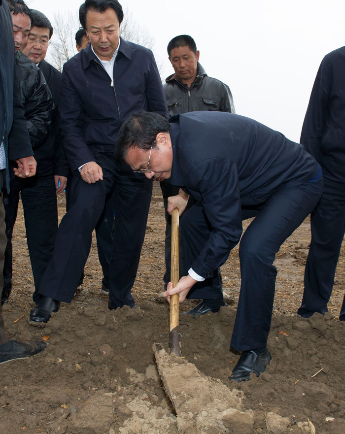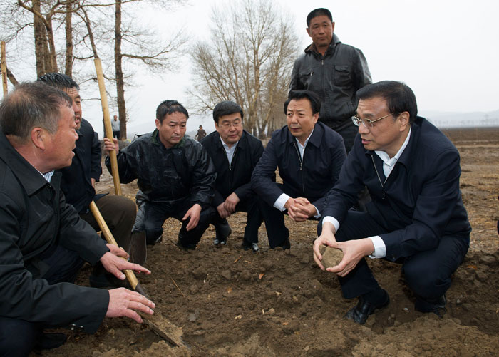 【李克強雨中翻地看墑情】28日下午,久旱的內蒙古赤峰喀喇沁旗迎來今年第一場春雨。牽掛著春耕時節墑情的李克強總理在小雨中踩著泥水來到田間察看,他抄起鐵鍬翻起泥土,蹲下抓起土塊仔細察看。見到只有表層土被雨水浸透,深層還是干的,李克強說,這也只有“十個水”吧,再能下一天一夜就好了。