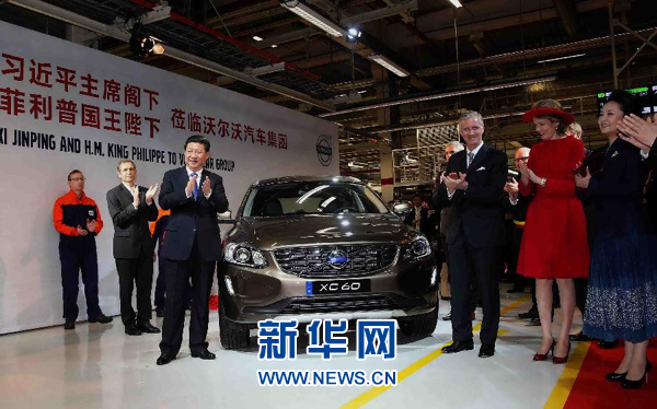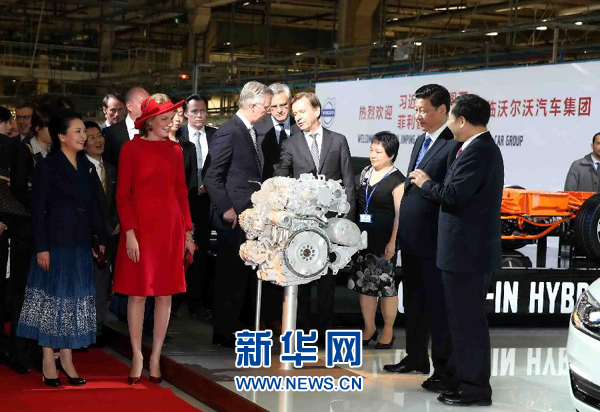 習近平和夫人彭麗媛、菲利普國王和瑪蒂爾德王后一同走進生產車間,參觀汽車展示和生產線,受到當地員工的熱情歡迎。企業負責人向習近平介紹汽車研發、生產和銷售情況。習近平和菲利普國王共同為公司出口中國的第30萬輛汽車揭幕。