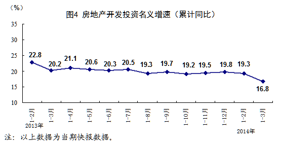 一季度,全國房地產開發投資15339億元,同比名義增長16.8%(扣除價格因素實際增長15.5%),其中住宅投資增長16.8%。房屋新開工面積29090萬平方米,同比下降25.2%,其中住宅新開工面積下降27.2%。全國商品房銷售面積20111萬平方米,同比下降3.8%,其中住宅銷售面積下降5.7%。全國商品房銷售額13263億元,同比下降5.2%,其中住宅銷售額下降7.7%。房地產開發企業土地購置面積5990萬平方米,同比下降2.3%。3月末,全國商品房待售面積52163萬平方米,同比增長22.9%。一季度,房地產開發企業到位資金28731億元,同比增長6.6%。