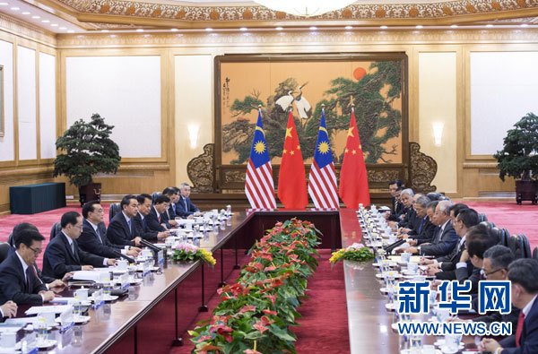 李克強(qiáng)指出,中馬合作領(lǐng)域?qū)拸V,內(nèi)容豐富。希望雙方發(fā)揮好雙邊經(jīng)貿(mào)磋商機(jī)制作用,充分利用中國(guó)-東盟自貿(mào)區(qū)政策優(yōu)勢(shì),拓展經(jīng)貿(mào)合作,力爭(zhēng)實(shí)現(xiàn)2017年雙邊貿(mào)易額1600億美元的目標(biāo)。加強(qiáng)基礎(chǔ)設(shè)施建設(shè)和互聯(lián)互通領(lǐng)域的合作,共同推進(jìn)中馬欽州產(chǎn)業(yè)園區(qū)和馬中關(guān)丹產(chǎn)業(yè)園區(qū)建設(shè)。加強(qiáng)投資、金融合作,繼續(xù)擴(kuò)大本幣在貿(mào)易和投資中的使用,攜手推進(jìn)亞洲基礎(chǔ)設(shè)施投資銀行籌建工作。擴(kuò)大航天、防務(wù)、司法和執(zhí)法安全、農(nóng)業(yè)合作及人文交流,進(jìn)一步增進(jìn)兩國(guó)人民間的相互了解和友誼,夯實(shí)中馬關(guān)系的民意基礎(chǔ)。密切在國(guó)際地區(qū)事務(wù)中的協(xié)調(diào)配合,共同推進(jìn)中國(guó)-東盟關(guān)系和東亞合作,促進(jìn)地區(qū)和平、穩(wěn)定與發(fā)展。