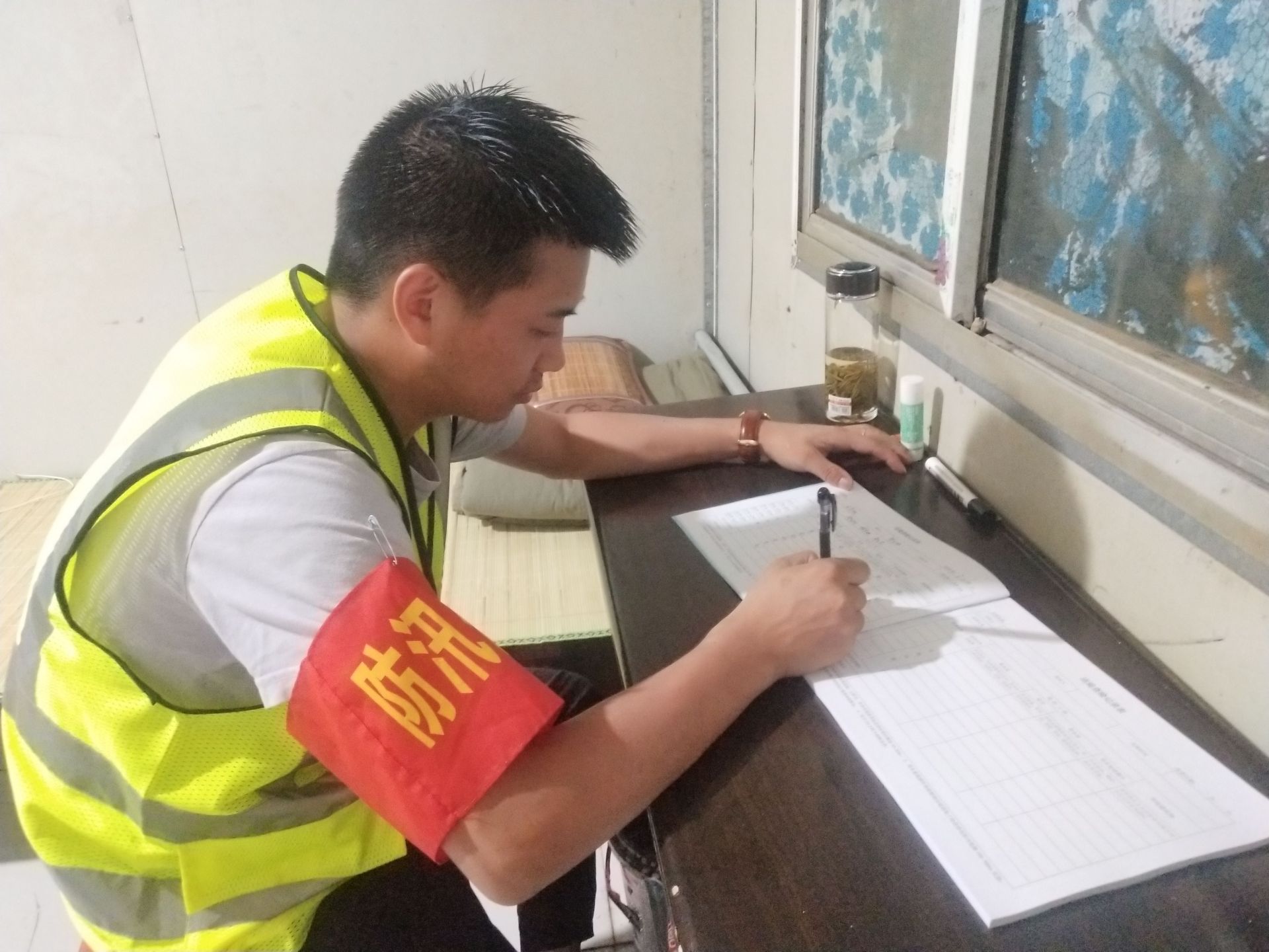筆者了解到,程超于2019年12月向黨組織遞交入黨申請書。他雖然不是一名黨員,但他始終以黨員的要求嚴格要求自己,關鍵時刻逆行而上做表率。程超同志身穿防護服,手拿木棍,腳踩泥土,始終堅持在防汛一線。他認真仔細巡查,不放過任何一個角落,巡查結束后他第一時間進入工棚填寫巡查記錄表,記錄巡查及處置情況。他認真地告訴筆者,巡查時不僅要勸導村民不要在周邊游玩,還要看堤岸水位漲落和管涌滲漏的情況,發現問題要第一時間上報。