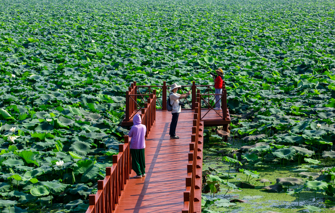 “江南可采蓮,蓮葉何田田”。走進宜秀區白澤湖鄉國家地理標志證明商標“白澤湖蓮藕”的千畝基地,接天蓮葉無窮碧,一派生機勃勃的景象。眼下正是荷花綻放的時節,在龍華村,荷花綻放妖嬈多姿;在芭茅村,村民不用出遠門,自家門口就能觀花賞景;在先鋒村,種植大戶正采摘新鮮的藕心菜。