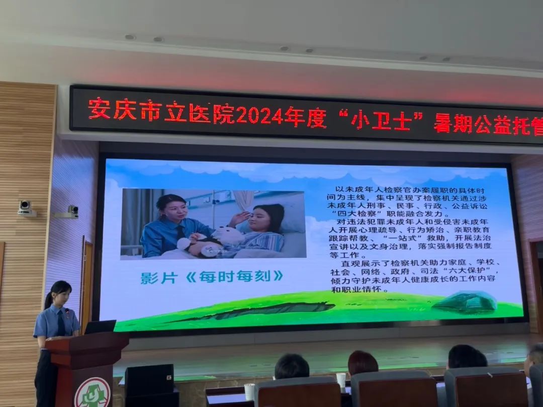 關(guān)愛未成年人健康成長是檢察機(jī)關(guān)義不容辭的責(zé)任。7月8日,宜秀區(qū)人民檢察院“宜啟來”未檢團(tuán)隊(duì)?wèi)?yīng)邀參加市立醫(yī)院2024年度“小衛(wèi)士”暑期公益托管班開學(xué)典禮,并為托管班的孩子們帶來一堂生動的法治課。